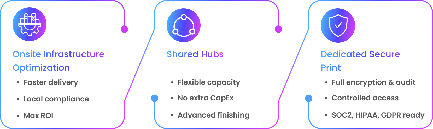 At Exela Enterprise Solutions (EES), we help organizations optimize onsite print infrastructure while leveraging shared production facilities for special features, surge volumes, and cost efficiency. This hybrid model ensures print operations are secure, scalable, and aligned with business outcomes, without excessive capital investments.