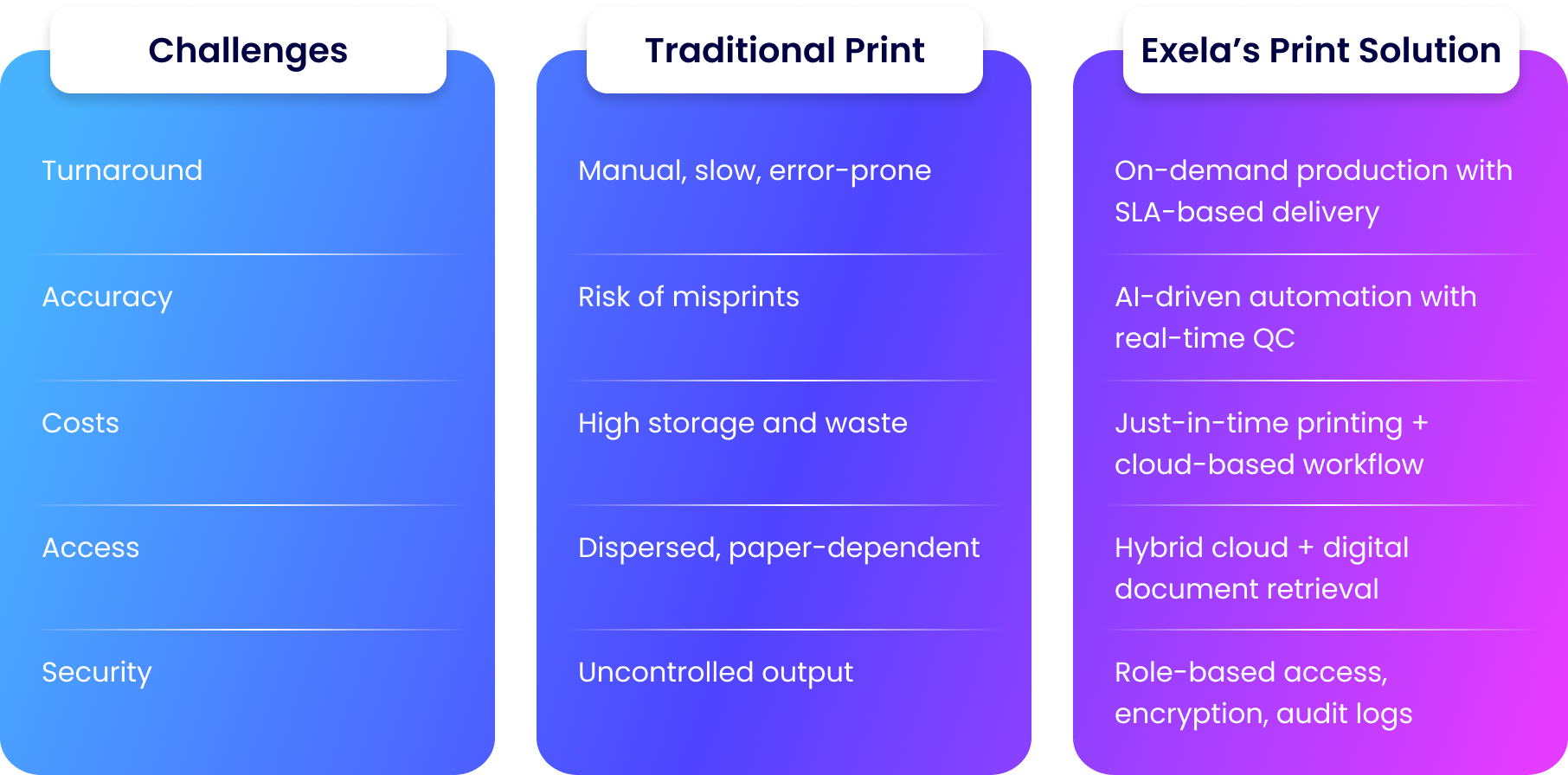 Additionally with Exela’s Production Print Hubs, organizations benefit from centralized bulk production with real estate optimization, reducing both physical footprint and processing delays.