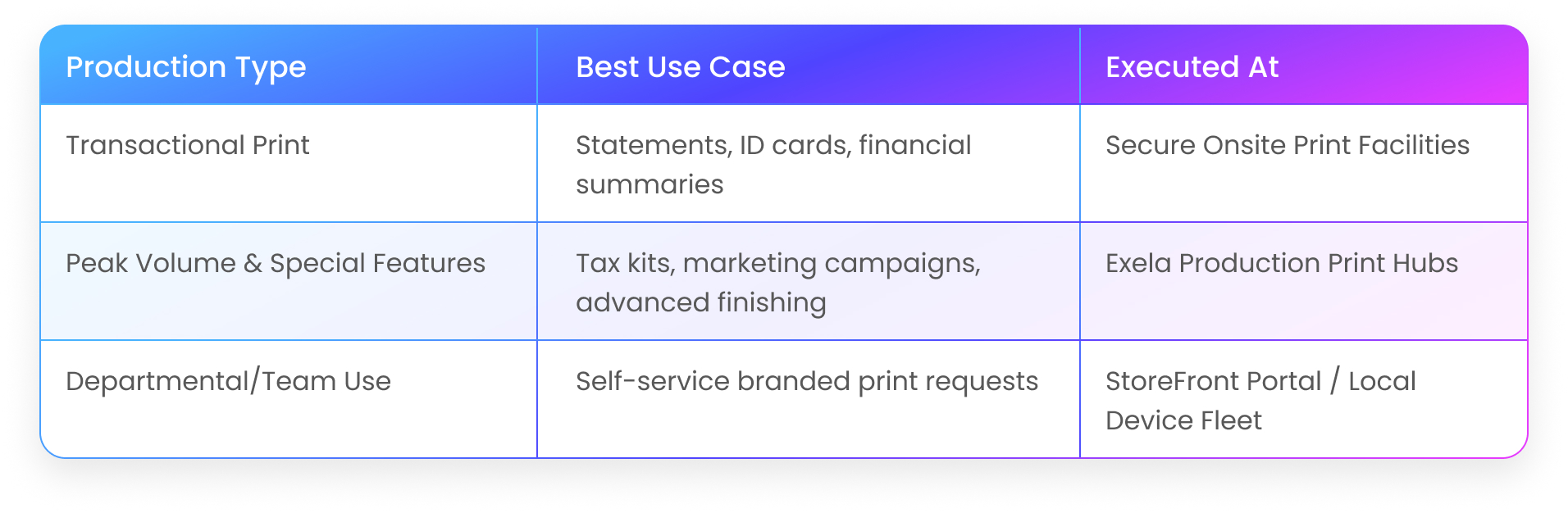 Exela’s print delivery model enables flexibility by routing jobs based on need, not infrastructure limitations. Here’s how we align production with enterprise priorities: